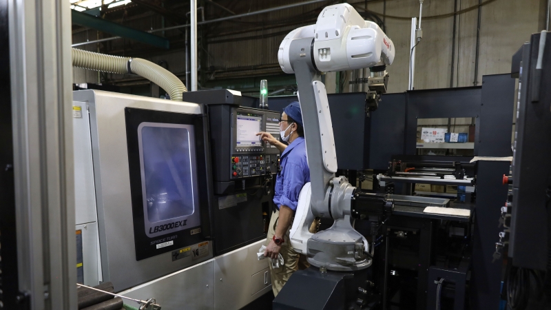 象印チェンブロック(大阪府大阪狭山市、津田晴将社長)は、工作機械へのワーク(加工対象物)のローディングとアンローディングを産業用ロボットで自動化する。扱うワークに合わせてエンドエフェクターやワークストッカーを内製するなど、ロボットがより活躍できる環境作りにも余念がない。自動化システムの導入に関して、苦労や工夫した点などを尋ねたら、今後自動化システムの導入を検討する読者の役に立つ話を聞くことができた。
