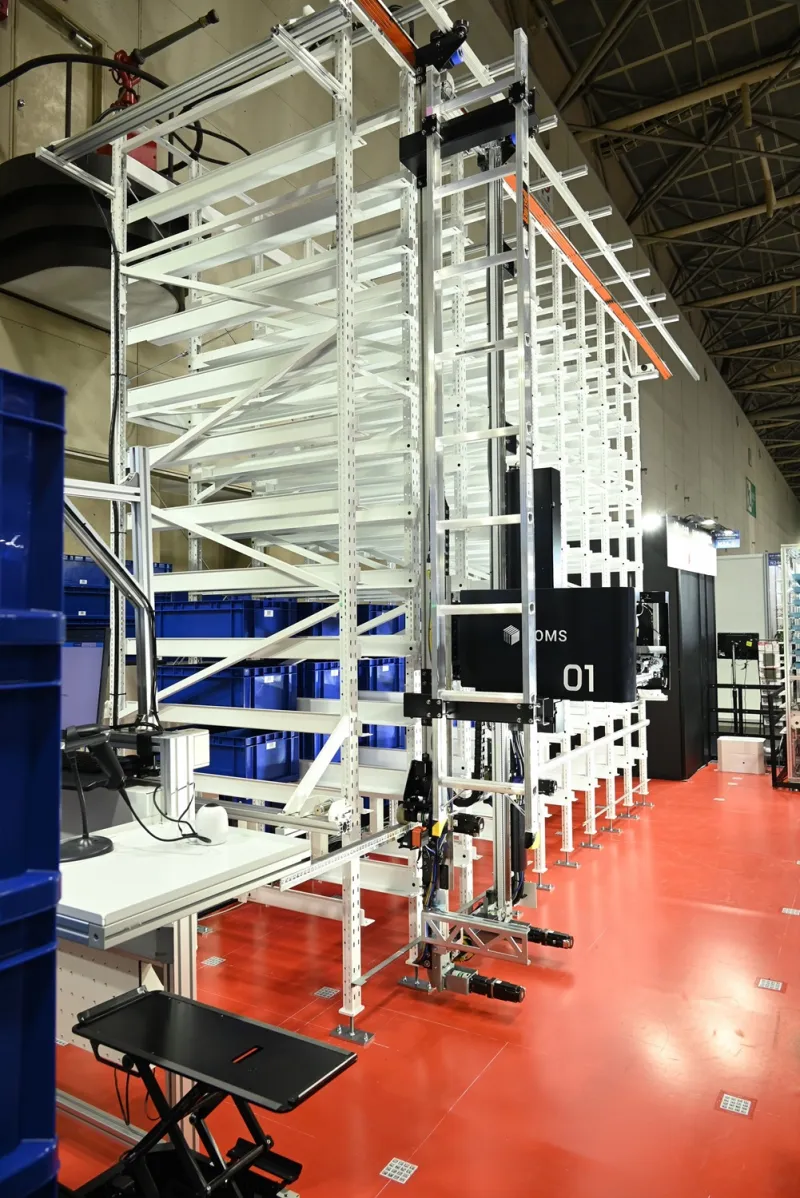 物流倉庫や工場内倉庫向けに自動倉庫を製造・販売するROMS(ロムス、東京都品川区、前野洋介社長)は小型自動倉庫「Nano-Stream(ナノストリーム)」を出展した。ナノストリームはコンテナや通い箱を保管するモジュール、着脱可能なクレーン、AGVで構成される。ブースではクレーンが上下に動いてコンテナを最下段に移動し、それをAGVが受け取って次工程に搬送するデモを実施した。