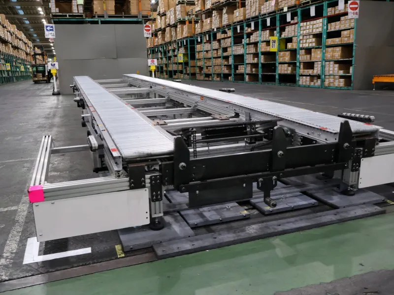 AMRがコンベヤーの出口側に到着する際、けん引台車が最前部の仕切り板のレバーを引っ張る構造となっており、仕切り板が開く。するとパレットはスライドし、自動的にけん引台車の荷台に載る。AMRが出発すると最前部の仕切り板が閉まり、後続の仕切り板が順番に開閉してパレットが次々と手前に移動するため、パレット同士の衝突を防ぐ。