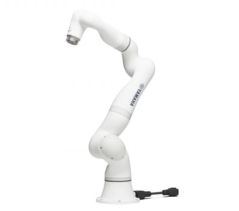 ヤマハ発動機は7軸構成で人間の腕に近い自由度を実現する同社初の協働ロボット「Yamaha Motor Cobot(ヤマハ・モーター・コボット)」を披露する。最大アーム長が1300mm、最大可搬質量は10kgと、長いリーチと大きい可搬質量で幅広い業種に適用できる。また、全軸に高精度トルクセンサーを内蔵しており、コネクターの挿抜や曲面へのバフがけといった力加減が求められる倣い動作を可能にする。従来の記述式プログラミングに加え、命令文が入ったブロックをつなぎ合わせてプログラムを作成する「ブロックプログラミング」も可能で、感覚的に操作できる。