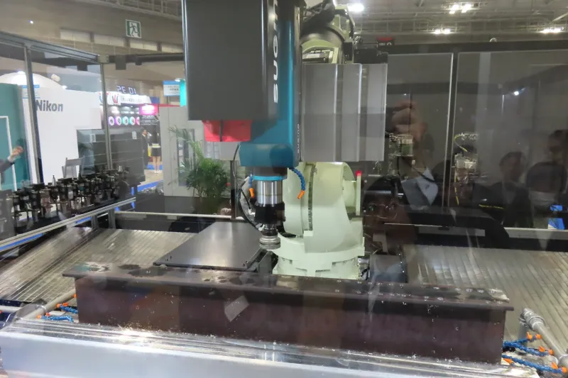 従来の大型マシニングセンタでは対応が難しい大型・長尺部品の切削加工や、多品種少量生産への対応に最適化し、柔軟性や設置しやすさ、コスト面などの課題解決につなげるという。会場では迫力あるデモに足を止めて見入る来場者が多かった。システム仕様は顧客の要望に合わせて柔軟に対応するという。