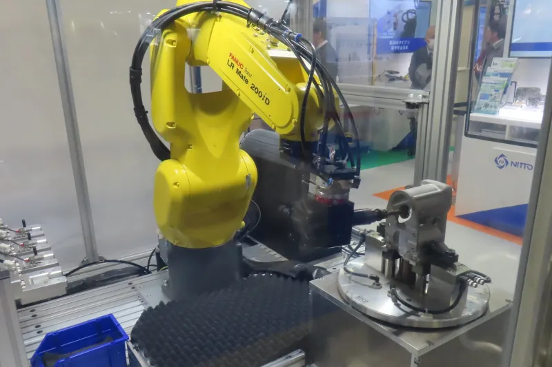 同社製の8kg可搬の協働ロボット「FD-VC8」と走行軸を使い、2つの加工工程セルを1台で自動化するもので、導入コストの低減を訴求した。ワークの補充や回収といったマシンテンディングをはじめ、それに伴う扉の開け閉めもロボットが行う。加工機は箱型の模型で表したが、来場者には十分イメージしやすいデモだった。
