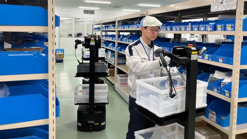 納入先は塩尻市内に新設した工場で、これまで外部委託していた物流関連業務を内製化し、物流と製造を一体化した。作業者は棚の前で部品をピッキングする作業に集中し、ピッキング後の搬送はラピュタPA-AMRが担う。