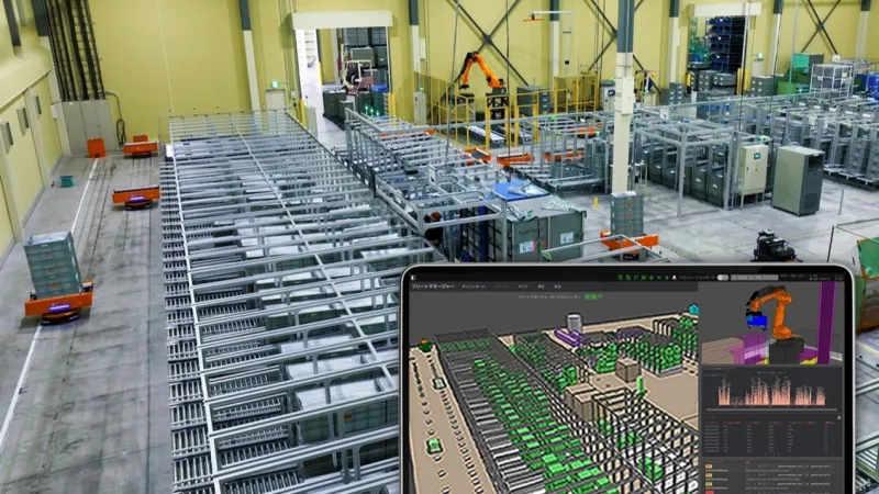 今回のシステムにはMujinOSで統合制御された倉庫管理運用システム(WES)を組み込んでおり、完成車メーカー側の倉庫管理システム(WMS)や製造実行システム(MES)と連動する。倉庫全体をデジタルツイン上でリアルタイムに可視化し、稼働データを活用した運用改善や、リモートメンテナンスを実現する。