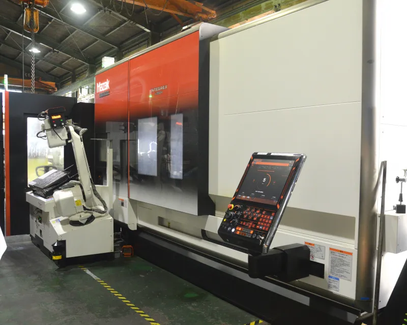 2023年に導入したのが、ヤマザキマザックの複合加工機「インテグレックス i-350H」とロボットシステム「TA-35/270」を組み合わせた自動化システムだ。複合加工機とは、複数の加工方法を1台に集約した工作機械を指す。江南工業所では18年にヤマザキマザックの複合加工機「インテグレックス j-400」を導入しており、その高い加工精度への信頼から上位機種であるインテグレックスi-350Hを採用した。さらに、熟練作業者の定年退職が相次ぎ、人手不足が深刻化していたこともあり、自動化にも踏み切ったという。