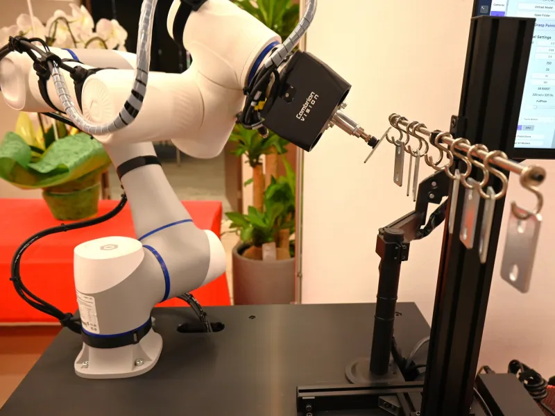 英国のCambrian(カンブリアン)のビジョンシステムを組み合わせたシステムは、ワークをフックに引っかける作業を自動化できる。AIを搭載した3Dビジョンシステムで従来は識別が難しかった光沢のある加工対象物(ワーク)や、ワーク同士の重なりを認識する。自動車部品の塗装工程は人手がかかる作業が多く自動化のニーズが多いという。