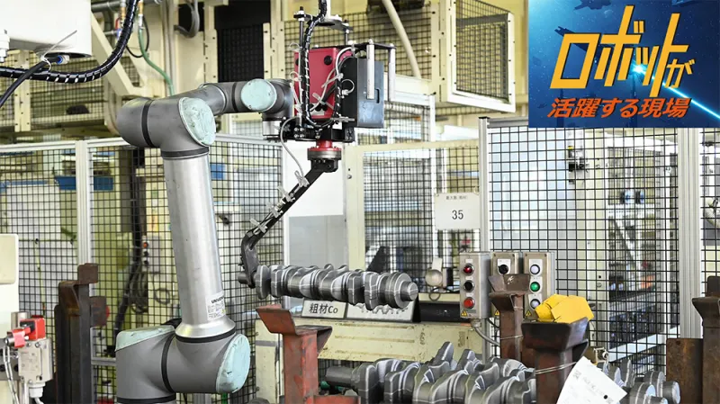 23年に10kg可搬の協働ロボットを使った自動化システムを構築し、クランクシャフトの加工ラインに導入した。パレット(荷役台)にばら積みされたクランクシャフトの原型「粗材」をロボットがビジョンカメラで認識し、干渉(周囲との接触)なく取り出せるものからピッキングして加工ラインに投入する。