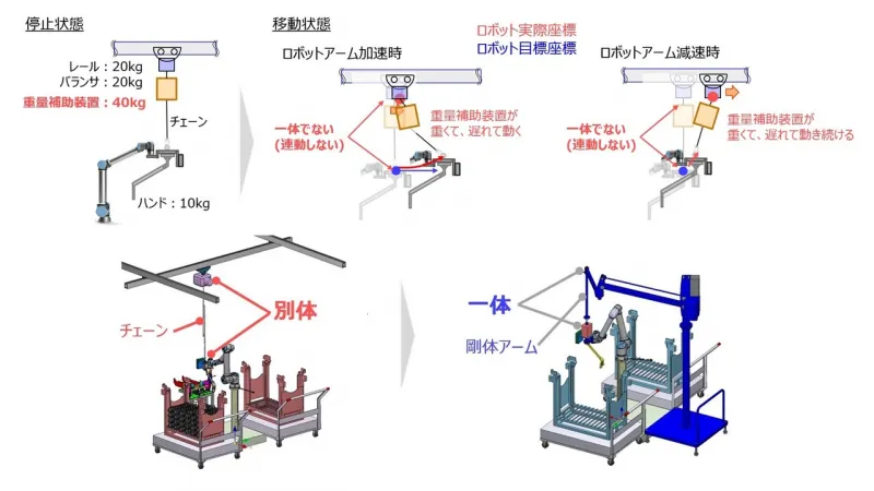 ホイストはロボットとチェーン1本でつながっているため、ロボットが動き出してからホイストが実際に動き始める時間にずれが生じる。さらに、ひとたびホイストが動き出すと加速度がつき、ロボットが停止してもチェーンに引っ張られてしまう。これでロボットは人と接触したと勘違いして“うそ”の保護停止が起こる。