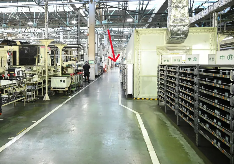 粗材を投入する作業者は普段、加工ラインから約120m離れた「品質チェック場」にいる。投入した粗材がなくなるとアンドン(電光表示板)が点灯し、作業者はその都度歩いて加工ラインに向かう必要があった。