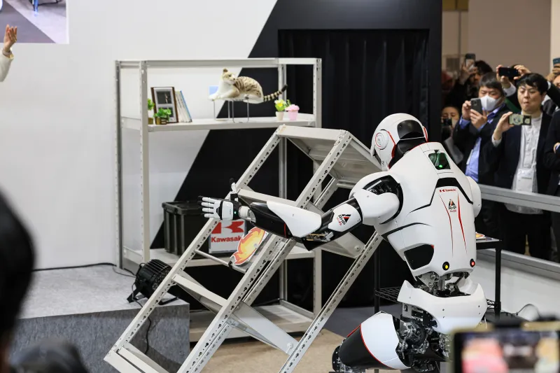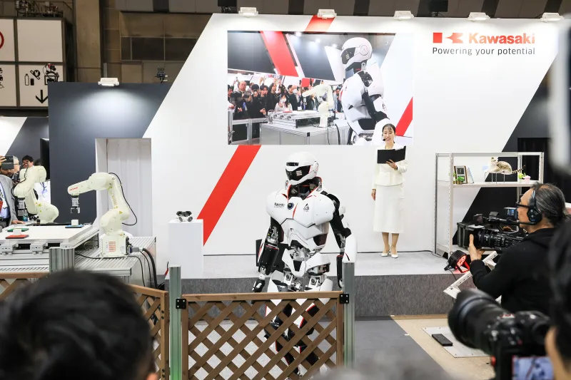 新型を含む多様なヒューマノイドロボットの展示で多くの来場者を集めたのが川崎重工業だ。特に、会期初日の12月3日に報道向けに公開したヒューマノイド(ヒト型)ロボット「カレイド9」の注目度は高く、iREX2025におけるヒューマノイドロボットの注目度の高さを表すように、プレス発表前に整理券を配布するほど大勢の記者が集まった。