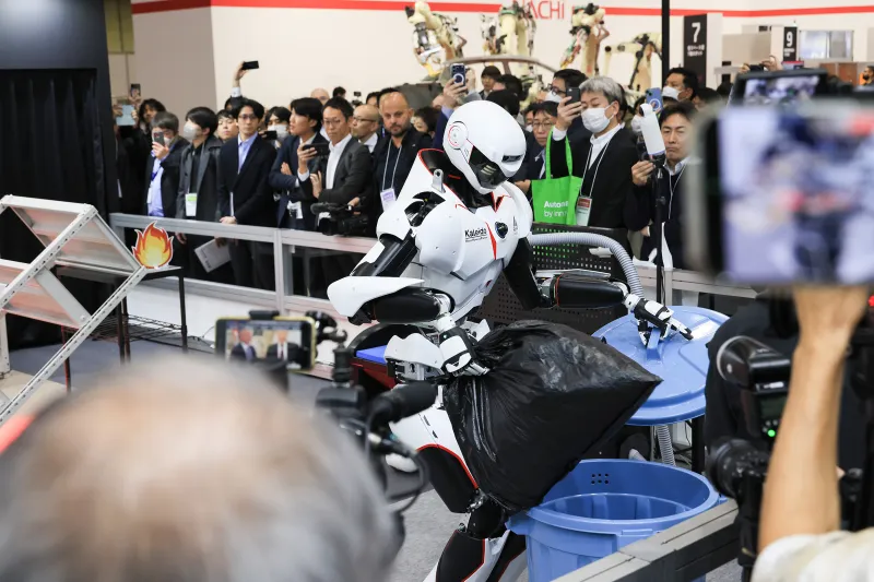 カレイド9はiREX2025がお披露目となる新型で、災害現場での救助活動や、口頭での指示に基づいて複雑な作業をするデモンストレーションを披露した。救助活動の妨げとなる倒れかけのラックを立て直した他、ほうきとちり取りで集めたごみをふたつきのごみ箱に捨てるなど事前のプログラムだけでは対処できない動作も組み込まれた。